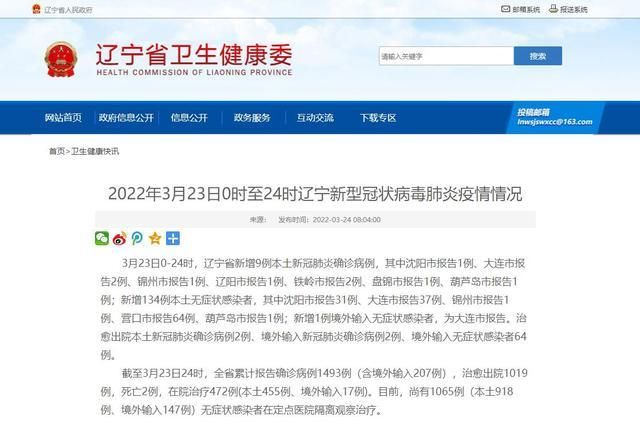新增本土无症状感染者445例(沈阳市134例,大连市134例,鞍山市12例,抚顺市19例,本溪市19例,丹东市3例,锦州市26例,营口市12例,阜新市 21例,辽阳市19例,铁岭市8例,朝阳市12例,盘锦市10例,葫芦岛市16例)。